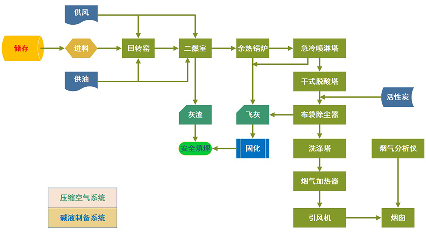 焚燒采用回轉(zhuǎn)窯+二燃室工藝,煙氣凈化采用急冷塔+脫酸塔+布袋除塵器工藝,配置先進的自動控制系統(tǒng),焚燒煙氣達標(biāo)排放,殘渣進入安全填埋場,飛灰進入固化車間固化后填埋。醫(yī)療廢物進行全過程管理,設(shè)置冷藏庫和周轉(zhuǎn)箱消毒系統(tǒng),醫(yī)療廢物則通過進料機構(gòu)進入焚燒系統(tǒng)處理。